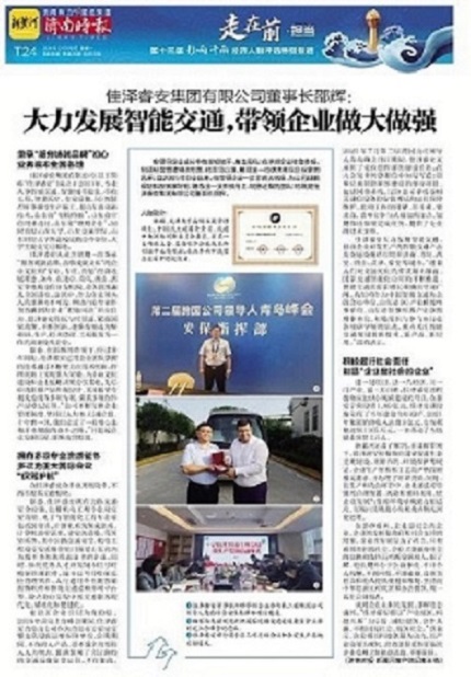 2021年7月,佳澤睿安董事長邵輝帶領企業(yè)參與第二屆跨國公司領導人青島峰會安保指揮部項目建設,為“第二屆跨國公司領導人青島峰會”的召開提供安保服務,包括指揮部建設項目、包括LED大屏視頻會議及通信設備的安裝調試和運行保障維護。